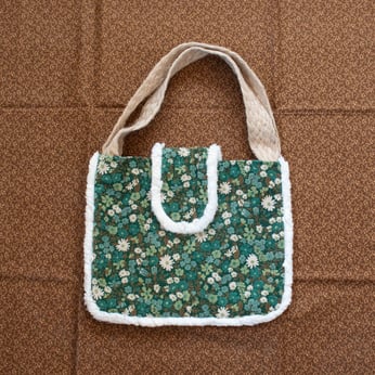 Green Floral Corduroy Handbag with Faux Fur Trim