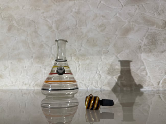converted Anchor Hocking decanter, functioning water pipe, swirled glass slide and geometric glass stopper (not pictured) included