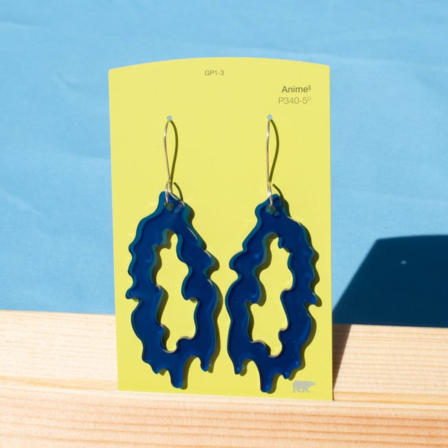 Lasercut acrylic earrings, transparent dark blue colored plastic, thin are 1/8 in thick, thick are 1/4 in thick. Sterling silver wire hook, bent by hand. Design is 2 1/2 inches long.