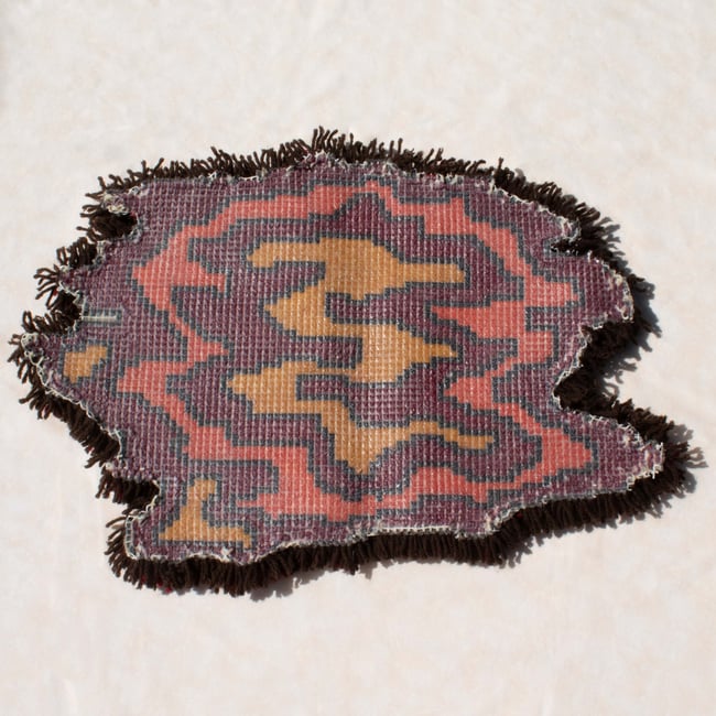 Rug lovingly latch-hooked by hand, 1 1/2 inch long shag with rubberized, nonslip backing. Approximately 16 x 24 in at its longest dimension, will be slightly smaller due to the design transfer process.